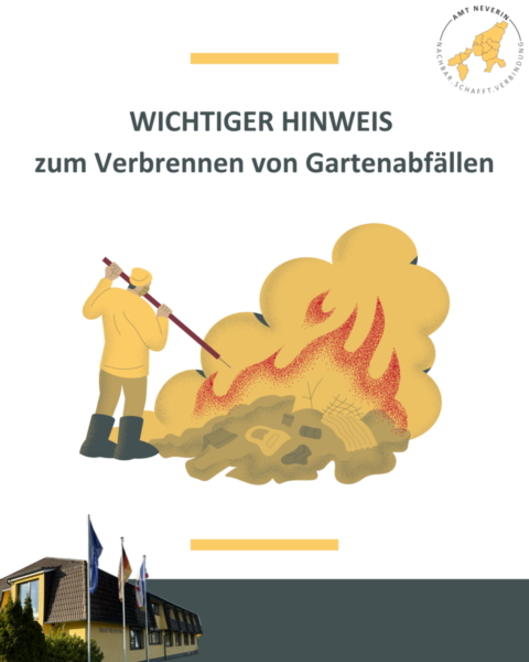 Entsprechend der Allgemeinverfügung des Landkreises Mecklenburgische Seenplatte über die Entsorgung pflanzlicher Abfälle von nicht gewerblich genutzten Gartengrundstücken für die Gemeinde Neverin mit dem Ortsteil Glocksin vom 20.09.2022, gilt auch den Monaten März und Oktober eines jeden Jahres ein Verbot des verbennen pflanzlicher Abfälle in der Gemeinde Neverin.
