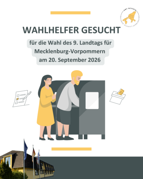 Im Amtsbereich Neverin werden ca. 140 Wahlhelferinnen und Wahlhelfer in verschiedenen Funktionen zur Besetzung der Wahlvorstände gesucht. Ein Wahlvorstand setzt sich aus einer Wahlvorsteherin bzw. einem Wahlvorsteher, einer Schriftführerin bzw. einem Schriftführer sowie deren Stellvertretungen zusammen. Zudem können bis zu fünf Beisitzer je Wahlvorstand berufen werden.